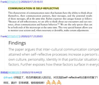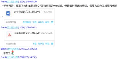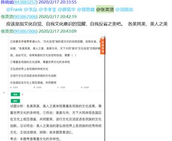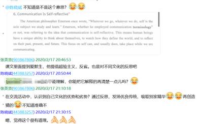 大量的网络资源使我们眼花缭乱,需要补充相应的视频解说、充分利用网上课程平台,为学生补充了MOOC资料《大学英语跨文化交际教程》等。备课组老师针对网课所必需资料的收集、上课可能出现的状况等,多次进行了qq群聊和视频、语音协商等。