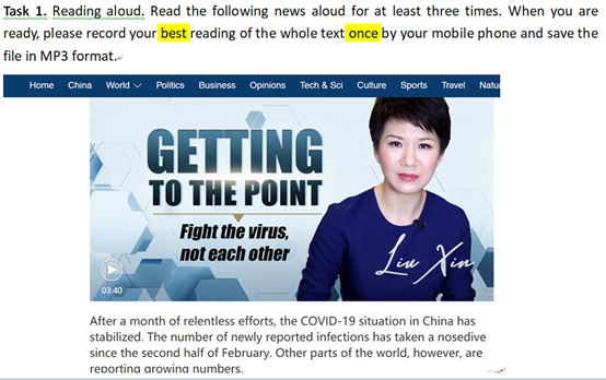 在《实用文体翻译》课堂上,张云霞老师在导入环节引入了China Daily 和VOA的几则时事新闻:“全国43200余名医护人员驰援武汉湖北抗疫”、“3月10日习总书记在武汉考察新冠肺炎疫情防控工作”、“武汉力争在3月10日左右实现方舱医院全休舱”等。接着,从新闻翻译的时效性入手,通过对这几则新闻中出现的新词、缩略词、专有名词以及修辞手法的逐一讲解自然过渡到了本讲的重点——新闻词汇特点以及翻译方法。在讲解语言知识的同时,也让同学们充分体会了全国上下齐心协力驰援武汉和湖北“抗疫”一线的壮举。