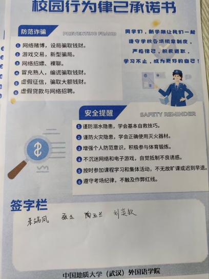 本次活动全面覆盖了外院学子所在的每一个寝室,以校园行为律己承诺书为载体,传达了学员对外国鱼们的关心和爱护。学院首先提醒同学们预防溺水事故,谨防火灾隐患等,增强学生安全意识和自我保护意识,鼓励学生积极参与体育锻炼,全面发展。除此之外,本次活动强调了遵守学校规章制度,有意识规范自身行为,自觉抵制不良诱惑的重要性。