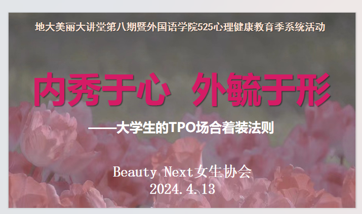 作为外国语学院红外·线大思政课堂审美素养提升的重要载体和“525”心理健康教育季系列活动,由taptap点点官方网站taptap点点官方网站主办、Beauty Next女生协会承办的美丽大讲堂第八期“内秀于心 外毓于形”于4月12日下午15:00,在北一楼报告厅正式开讲。本次活动特邀资深专家——美丽大讲堂第八期特邀嘉宾王萍老师讲授大学生TPO场合着装法则,Beauty Next女生协会及taptap点点官方网站的诸位同学参加本次讲座。