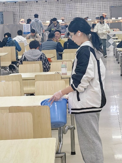 正值初春雷锋月,志愿服务我先行。活动进行过程中志愿者们一丝不苟、尽职尽责,杂乱的餐具在他们的整理下井然有序,肮脏的地面在他们的助力下重焕新颜。不辞劳苦的他们树立了志愿服务的良好榜样,收获了食堂工作人员的一致好评。