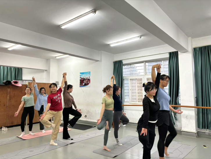 在本次瑜伽活动中,凌慧老师设计了双人配合抬腿的动作。同学们在老师的细心指导下,尝试完成舒展身心的双人瑜伽动作,既感受到了身体的潜力,也在和其他同学一同练习的过程中体会到配合与合作的魅力。
