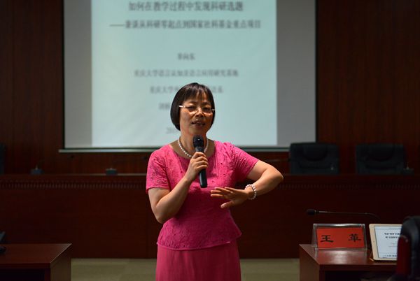 随后,刘芳副院长主持讲座,邀请辜向东教授开场主讲。辜老师讲座的题目是“如何在教学过程中发现科研选题——兼谈从科研零起点到国家社科基金重点项目”。她从自身的科研经历出发,生动诠释了自己如何从一位科研小白华丽转身,在女性扮演的多重角色中平衡、解决工作和生活的各种矛盾、冲突,一步步地完成从专科毕业生到业内学术大咖的变身历程。通过总结个人及团队在过去二十多年里的实践经验,辜老师提出,要广泛涉猎、敏锐思维,将普及与经典相结合,关注国家大事并联系自己的专长,在实践中去寻找科研突破点。同时,她还强调团队合作与创新,在过程中不断进行总结与反思,积极交流与促进,拥有国际眼光。在日常生活中,我们大学英语教师,尤其是大学英语女教师要充分利用碎片化时间,享受读书,挤出时间搞科研,将教学、科研和家庭生活完美结合。除了科研的点拨,辜老师还以丰富的人生阅历在教学、育人甚至家庭生活方面为大家提供建议,贡献了无数金句,引起大家共鸣。从讲座和互动中,听众发现辜老师成功演绎了众多女性角色。她是学识渊博的睿智教授,诲人不倦的资深博导,精明强干的团队leader,家里家外一把抓的完美wife,“有其子必有其母”的“优质”mother,和蔼慈祥的年轻grandma。她讲得热情欢脱、风趣幽默、金句频出,听众们听得悠然自得、眉飞色舞、兴致勃勃。
