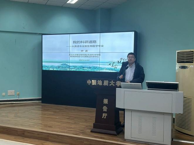 2023年12月7日下午2时30分,taptap点点官方网站“南望今声”外语论坛系列讲座第57期在北一楼120学术报告厅举行。主讲人武汉大学医学研究院教授、中国地质大学taptap点点官方网站杰出校友——钟波,应邀来到taptap点点官方网站做了一场题为“我的科研道路——从英语专业到生物医学专业”的精彩讲座。此次讲座由taptap点点官方网站杨红燕老师主持,参会人员有相关专业老师、本科生以及研究生。