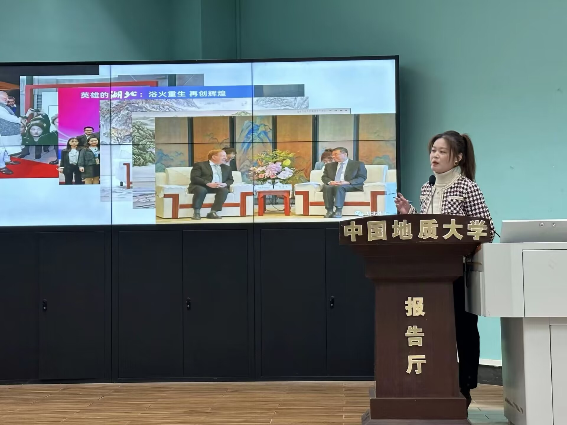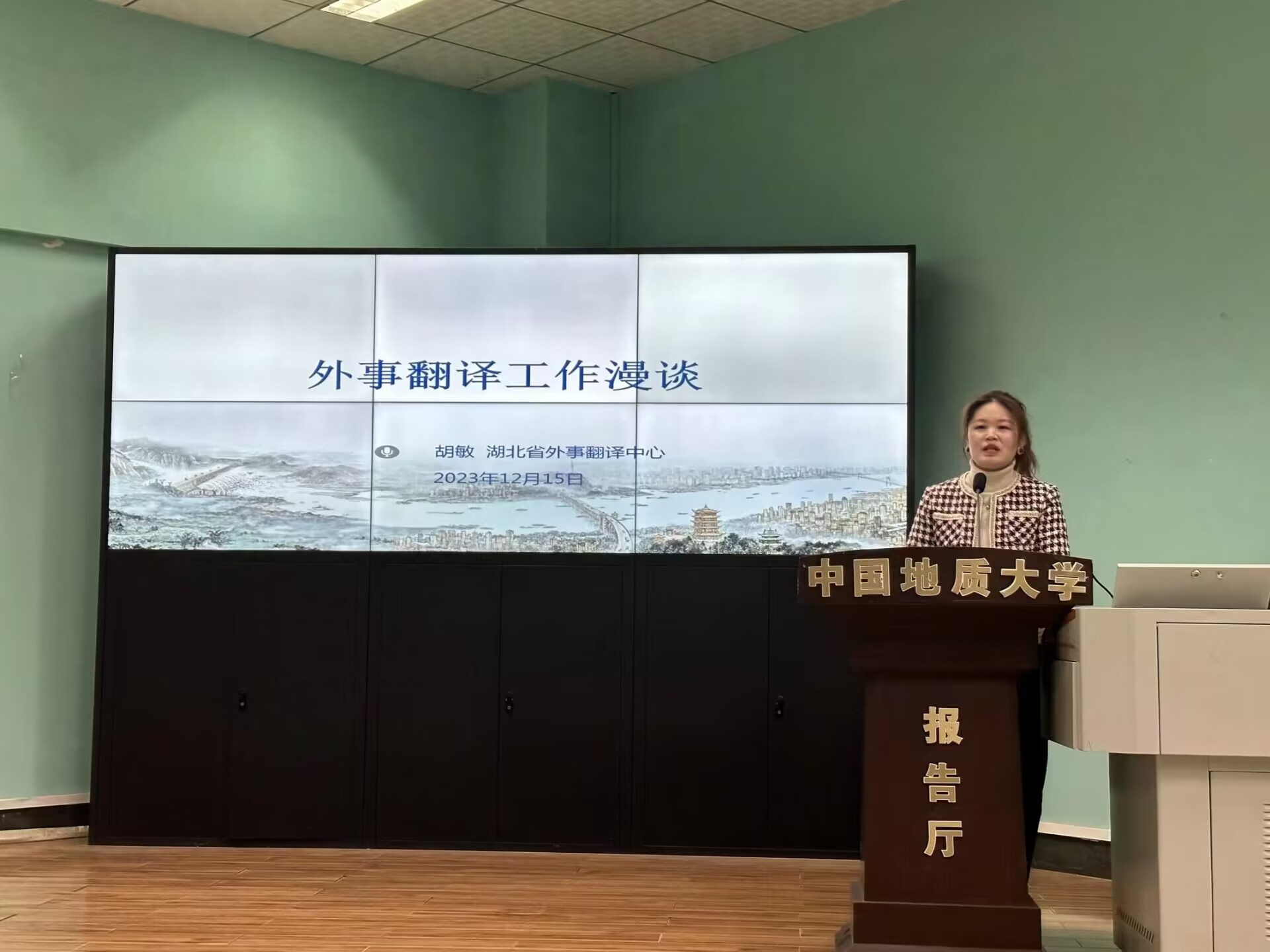 2023年12月15日上午9时00分,taptap点点官方网站“南望今声”外语论坛系列讲座第60期在北一楼120学术报告厅举行。主讲人湖北省外事翻译中心英语翻译胡敏女士,应邀开展了主题为“外事翻译工作漫谈”的精彩讲座。此次讲座由taptap点点官方网站杨红燕副教授主持,八十余名师生参会。