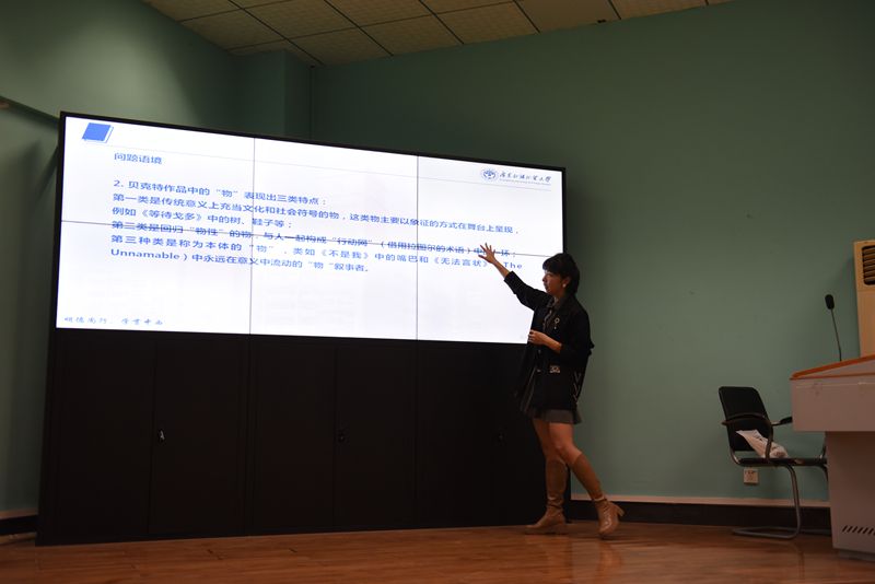 随后,为了帮助现场师生更好地理解讲座内容,郑杰教授带领大家共同阅读了剧本《克拉普的最后一盘录音带》并为大家播放了该剧的剧场版视频。通过阅读剧本、观看视频这样非常直观的方式,大家对该剧本内容及其作者贝克特有了更为充分的了解,这为讲座后半部分内容的顺利开展奠定了基础。随后,郑杰教授阐述了自己的基本观点。郑杰教授认为,贝克特的机器是一种“生产性”而非“缺失性”的想象,是一种使消费者成为生产者的生产方式。录音机和录音在舞台上制造了新的时间和空间,在新的时间和空间中,物制造了依赖于物和主体意识的心理现实。在这种意义上,录音构建了意识的新的物质形态。从当时的录音技术入手,郑杰教授细述了录音机和录音带背后的机器逻辑。以此为切入点,郑杰教授阐释了录音机作为“生产者”的物,其与人之间的关系。郑杰教授认为,在录制磁带和播放磁带的过程中,克拉普既是主体又是客体。而在这个过程中,录音带作为人类活动进程的参与者,它参与构建甚至桎梏了人的意识和自我。随后,郑杰教授还谈到了贝克特对于物和意识的认识与康德物自体概念的影响关系。郑杰教授认为贝克特深受普鲁斯特、叔本华和康德的影响,在处理记忆和意识的方法上,并没有脱离笛卡尔式的传统主体哲学。最后,郑杰教授从叙事结构、叙事聚焦、叙事情节和行动三方面对“物叙事”进行了总结阐述。