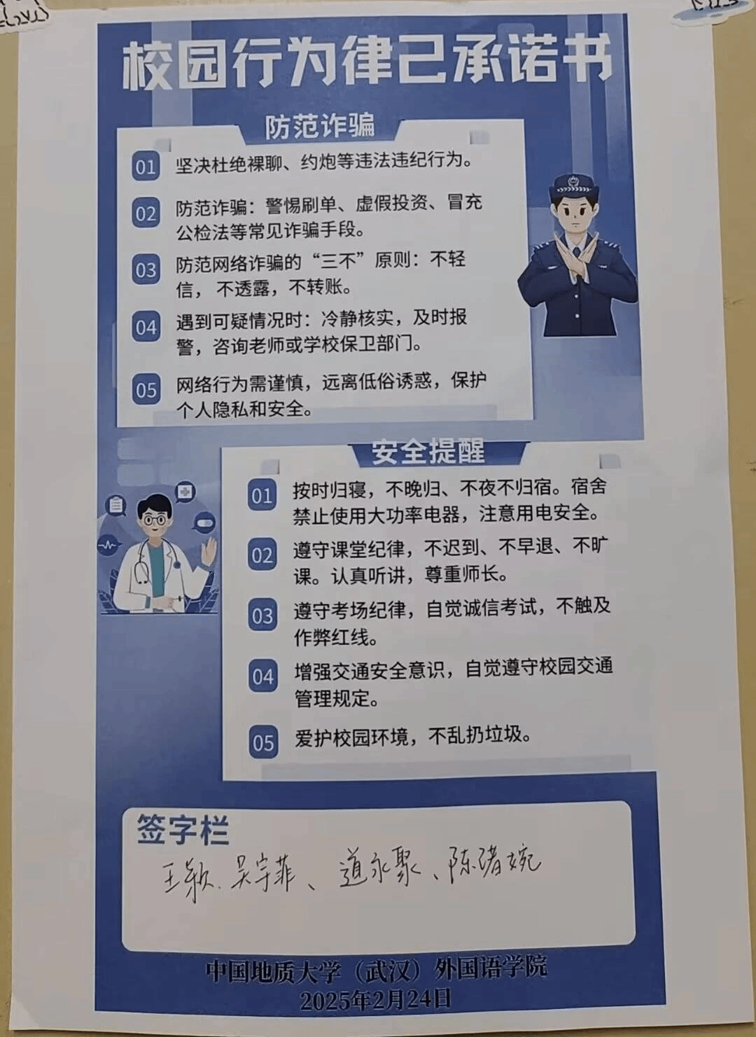 taptap点点官方网站本研学生积极参与本次活动,校园行为律己承诺书发放到寝室后,同学们以寝室为单位进行承诺书的研读和学习探讨,明确了新学期学习生活律己要求,熟读了反诈提醒与安全建议,进行了深入的反思与学习,并郑重地在承诺书签字栏处留下签名,表达了对校园安全稳定的支持与承诺。这一活动不仅增强了学生的自律意识,也进一步凝聚了集体力量,为构建安全和谐的校园环境奠定了坚实基础。