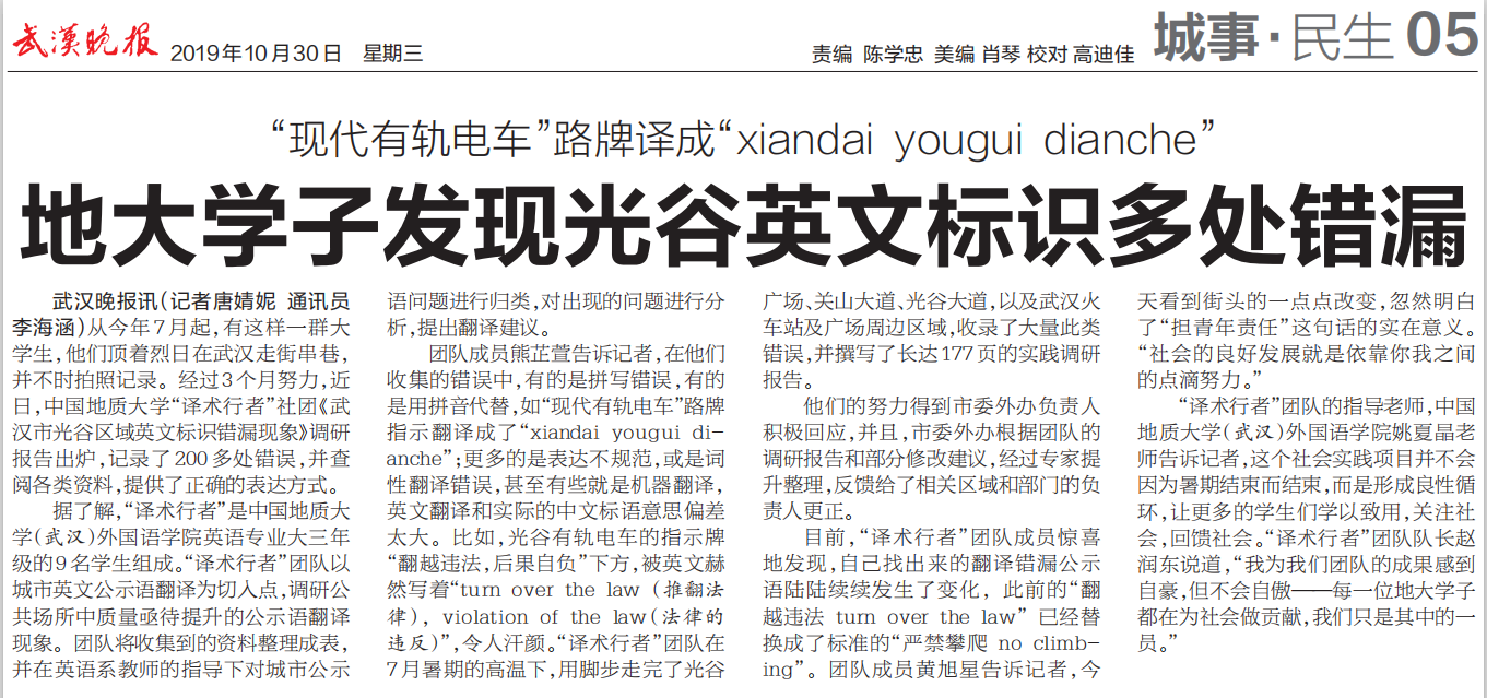 (通讯员 赵润东)2019年10月30日,长江日报和武汉晚报接连报导taptap点点官网暑期社会实践团队“译术行者”2019年暑期针对武汉城市英文标识的调研,11月1日,武汉电视套四套“经视新看点”栏目对团队成员、指导老师以及学院领导进行了专题采访。