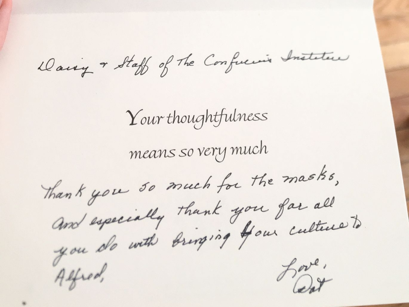 三月和四月,我们所居住的孔家变成了一个捐赠口罩的重要桥梁,我们通过邮件告诉学校还在工作的教职工和留学生,还有周边社区的居民们,如果非常需要口罩(由于工作性质,像消防队、社区医院、学校食堂等部门还在工作;有些留学生无法回国,也滞留在学校),可以邮件联系我们,我们会根据情况以及我们手头多余的口罩数量进行捐赠。我们把口罩用信封包起来在信封上写好名字,放在门口的信箱,通过邮件告诉他们取口罩的时间,这样就实现了零接触捐赠口罩。