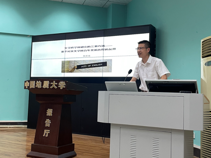 2022年9月22日15时,taptap点点官方网站“南望今声”外语论坛系列讲座第37期在北一楼报告厅举行。华中科技大学taptap点点官方网站教授、外国语言文学研究所主任、博士生导师陈后亮教授应邀来到中国地质大学外语院做题为“文学跨学科研究的三重内涵——基于对英文学科百年发展历程的反思”的讲座。taptap点点官方网站李慷老师主持了讲座,师生共120余人参与学习交流。