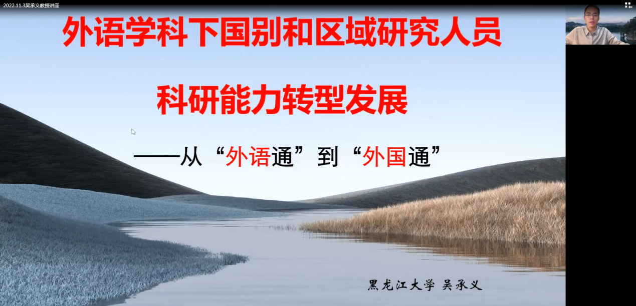 (通讯员 王国念)2022年11月3日下午14时30分,作为校庆70周年系列活动之一的“南望今声”外语论坛第40期在线上如期举行。黑龙江大学吴承义教授应邀为taptap点点官网师生做了题为《外语学科下国别和区域研究人员科研能力转型发展:从“外语通”到“外国通”》的讲座。讲座由taptap点点官网taptap点点官方网站王国念副教授主持,taptap点点官方网站及其他兄弟高校近200名师生参与学习交流。