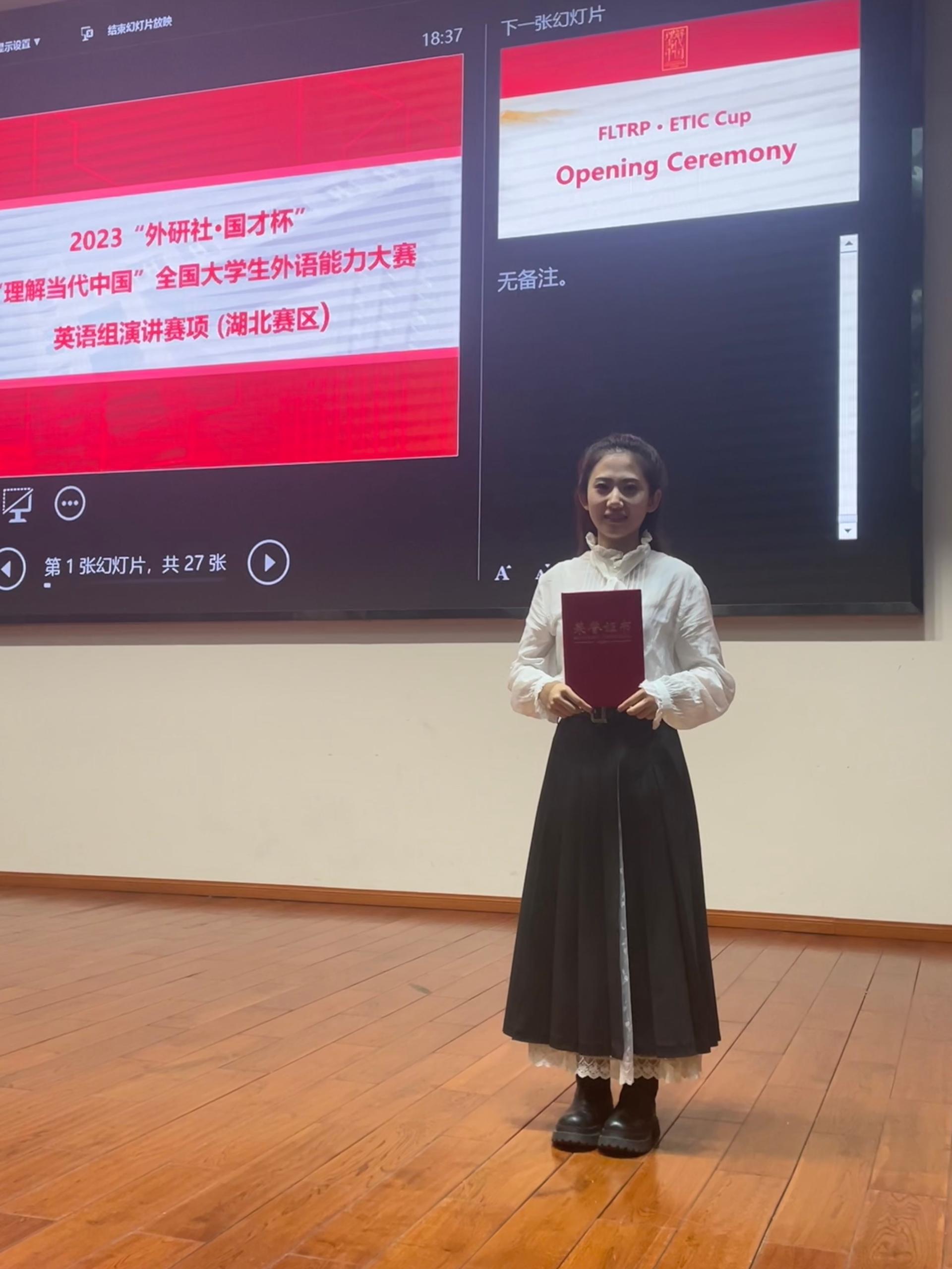 (通讯员:杨红燕)2023年10月29日,由湖北省教育厅主办,湖北省高等教育学会大学外语教学专业委员会、外语教学与研究出版社协办的2023“外研社·国才杯”“理解当代中国”全国大学生外语能力大赛演讲赛湖北赛区决赛在湖北大学举行,来自省内各高校的50名选手参加角逐。taptap点点官网taptap点点官方网站2020级赵彬琪同学凭借扎实的语言功底和稳重的舞台风格在此次比赛中荣获银奖并晋级国赛。