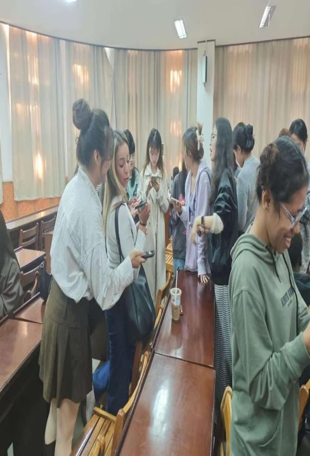 传话筒游戏中,大家依次传递信息,如同一场神秘的信息接力赛。随着信息的传递,各种意想不到的变化悄然发生,紧张又充满趣味的氛围让每个人都沉浸其中,为活动增添了无数的欢乐与惊喜。两院学生在游戏过程中增加了词汇积累,提升了中英口语交际能力。同学们也在互动游戏中结识许多志同道合的外国朋友,感受到了文化交流碰撞所带来的震撼与吸引力。