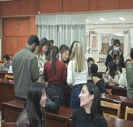 在对彼此都有了一个初步的认识后,此次活动也便迎来了它的重头戏——面对面交流,交朋友。经过前面的铺垫,大家心中的热情早已被点燃纷纷走向彼此,开始交谈。现场一片欢声笑语,许多同学都交到了来自不同国家的朋友。