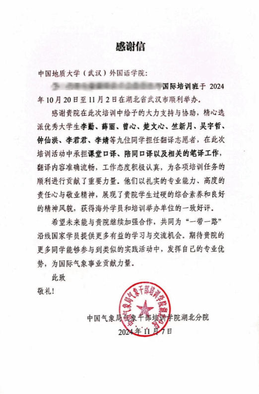 11月7日,中国气象局气象干部培训学院湖北分院给taptap点点官网发来感谢信,以感谢taptap点点官网师生在此次培训活动中给予的大力支持与协助。