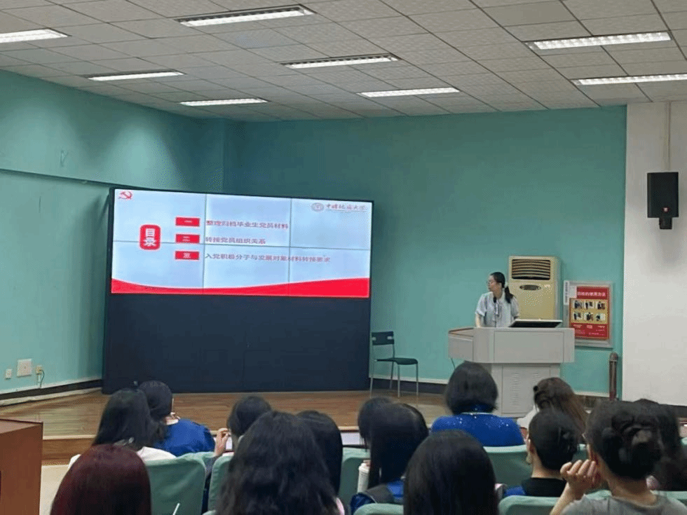 黎颖就毕业班党员材料归档与组织关系转接工作进行说明。她强调党员材料归档的重要性,要求毕业生党员认真核对入党志愿书、思想汇报等材料,并按照规范装订成册。她详细介绍党员组织关系转接的方式和流程,针对不同去向的同学提供了具体的解释,特别提醒同学们要注意转接时间节点,确保准确高效完成组织关系转接工作。此外,她就入党积极分子与发展对象材料的转接工作进行了布置。
