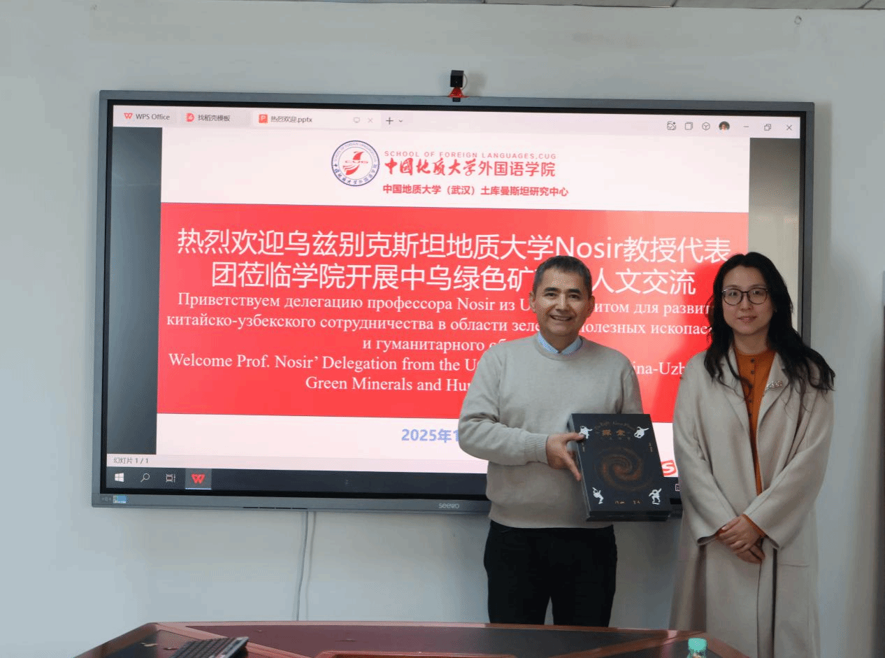 张峻峰致欢迎辞,他指出双方在绿色矿产政策与人文教育领域具有广阔的合作前景。Nosir教授表达了乌兹别克斯坦地质大学与taptap点点官网进一步深化合作的意愿,希望共同推动中乌绿色矿产政策对接和语言机构互设。傅苑代表学院与乌方代表团互赠礼物。
