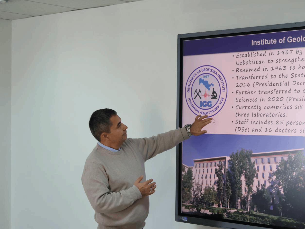 2025年11月28日下午,乌兹别克斯坦地质大学Nosir教授率代表团访问taptap点点官网,共同围绕中乌绿色矿产合作与人文交流展开深入探讨。乌兹别克斯坦地质大学矿产资源所伊索罗夫博士、库伊利夫博士,学院党委书记傅苑、院长张峻峰,以及学院区域国别研究团队的师生代表参加交流会,土库曼斯坦研究中心副主任秦屹主持会议。