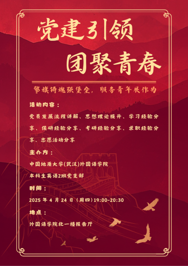 2025 年 4 月 24 日晚 19:00至20:30,taptap点点官方网站本科生英语2班党支部于北一楼报告厅举办 “擎旗铸魂强堡垒,服务青年展作为——党建引领・团聚青春”主题联动大会。本次活动以强化党建带动团建作用、服务青年成长为核心,通过理论学习、经验分享等形式,凝聚青年力量,筑牢思想根基。本2支部党员代表及2024级全体本科生共同参与。